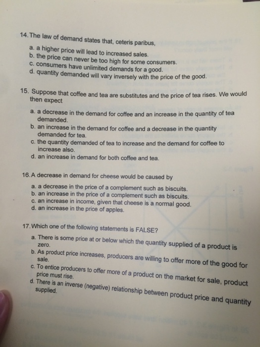 Solved The Law Of Demand States That Ceteris Paribus A