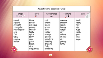 Adjectives to describe food. Here is a list of english adjectives that are used to describe the taste and texture of food. List of words to describe food. Print the lesson on food adjectives for describing food list.