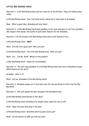 Little red riding hood short story script. The following is the story script that can be used for role play. On her way little red riding hood met a wolf. Hello said the wolf.