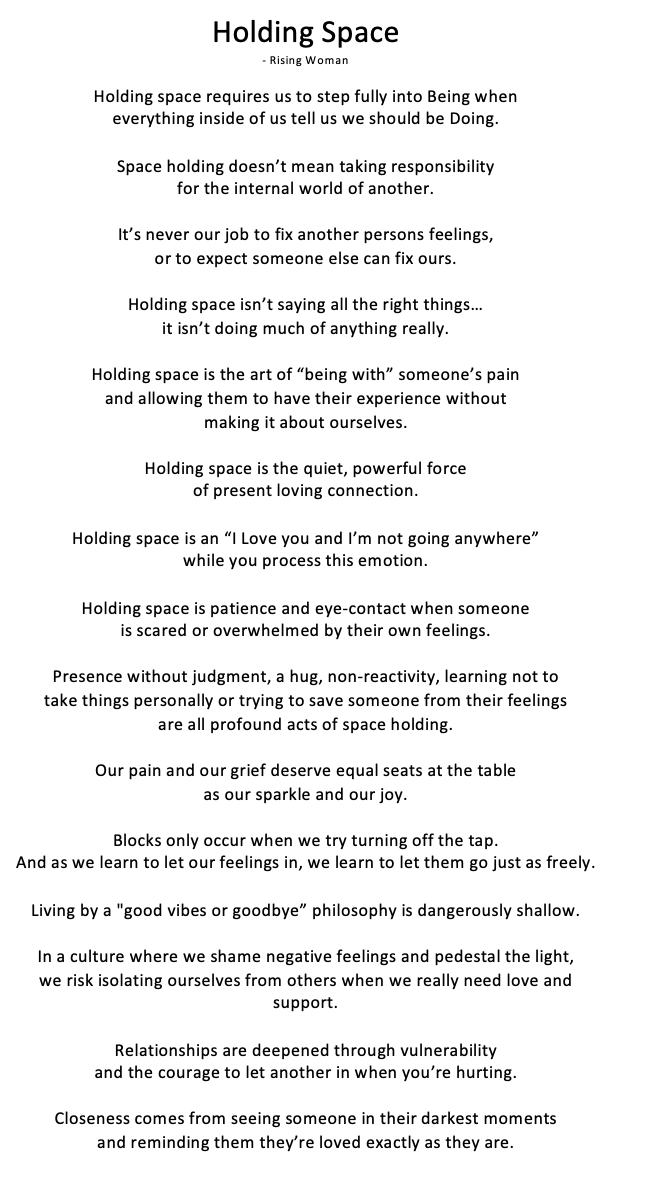 What holding space means. You shouldn t have an agenda and the help should be without any judgment.