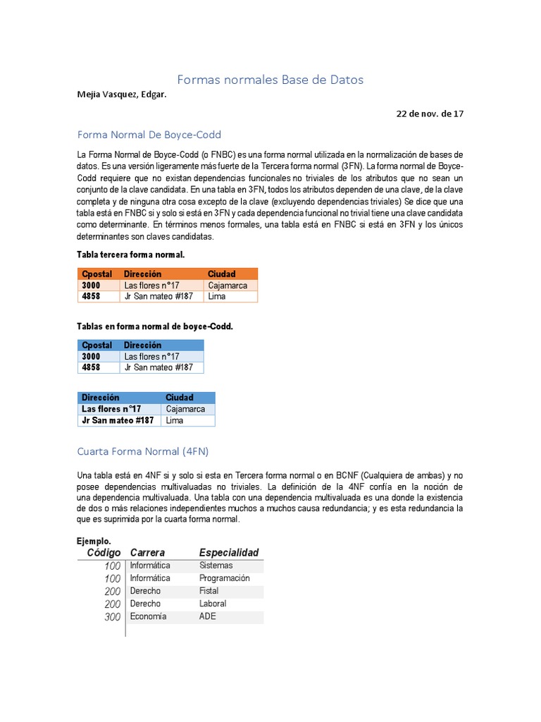 Gráficamente podemos representar la forma normal de boyce codd de la siguiente forma. Forma normal de boyce codd bcnf el inventor del modelo relacional edgar codd propuso la teoría de la normalización con la introducción de la primera forma normal y continuó extendiendo la teoría con la segunda y tercera forma normal. Es una versión ligeramente más fuerte de la tercera forma normal 3fn.