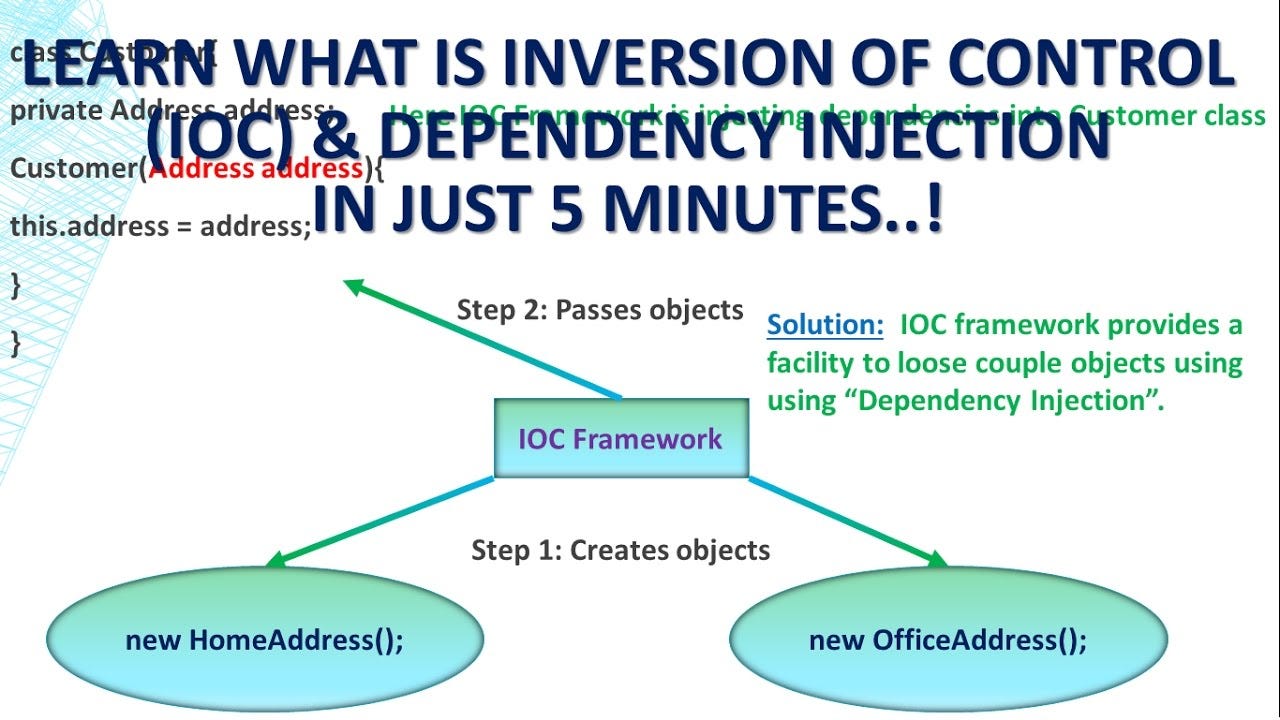 Folks are particularly interested in the dependency injection pattern and the meaning of inversion of control or ioc. Let s understand the ioc and dependency injection first. We want our software components to do their given jobs.
